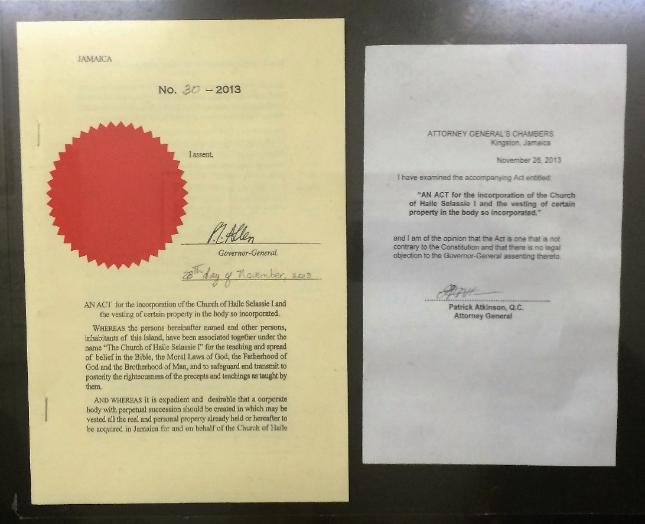 | July 11, 2013 (Youtube video ) The Church of Haile Selassie I application accepted by Jamaican parliament |