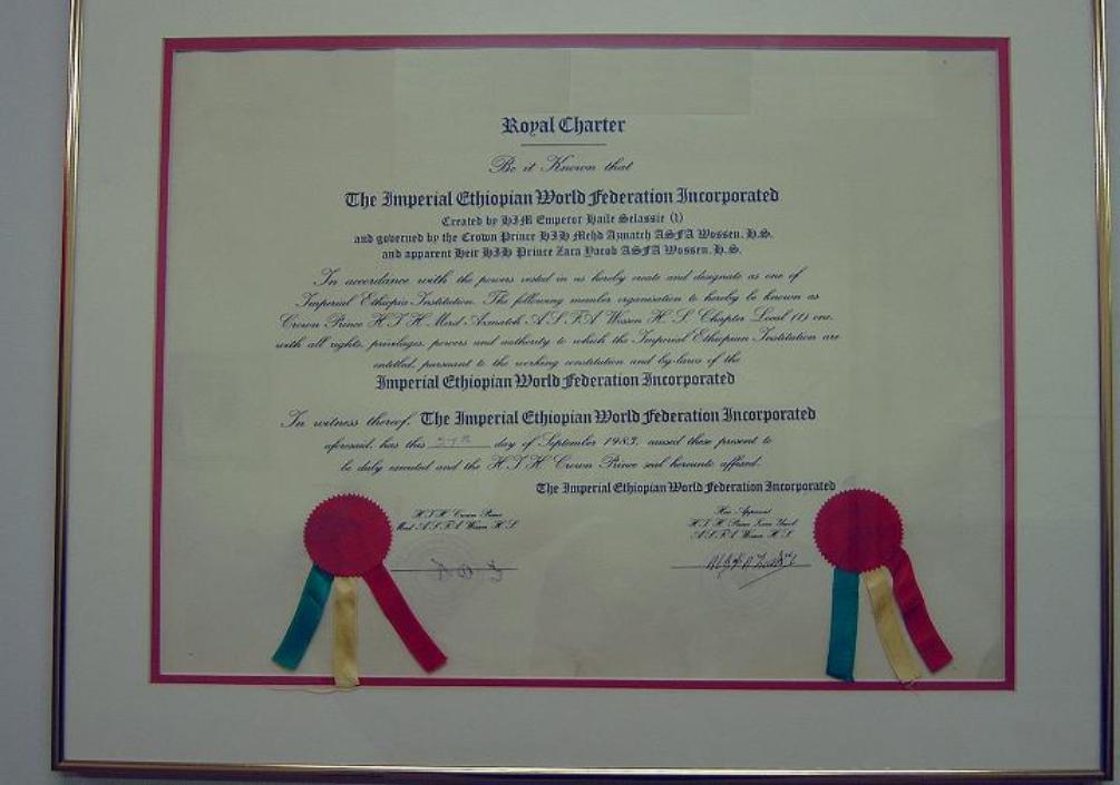 In accordance with the powers vested in us hereby create and designate as one of Imperial Ethiopia Institution. The following member organisation to hereby be known as Crown Prince HIH Merd Azmatch ASFA Wossen H.S. Chapter Local (1) one. with all rights, privileges, powers and authority to which the Imperial Ethiopian Institution are entitled, pursuant to the working constitution and by-laws of the Imperial Ethiopian World Federation Incorporated